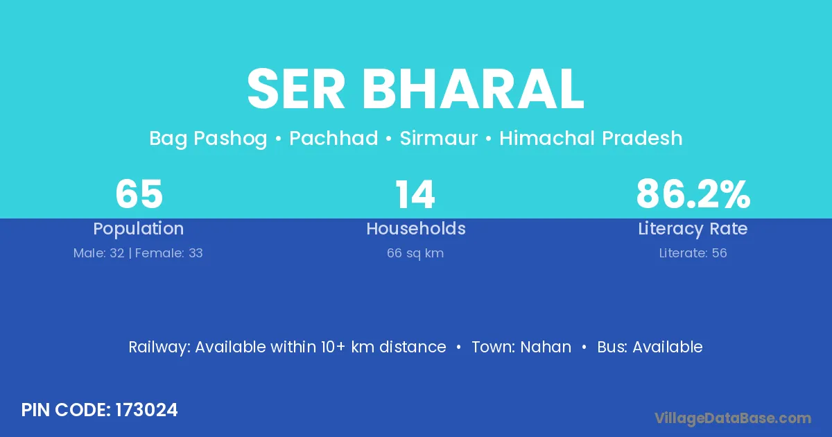 Ser Bharal village has a total population of 65 people, of which 32 are males and 33 are females.