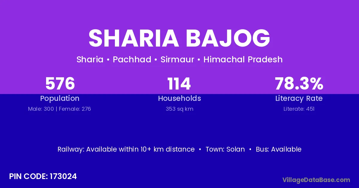 Sharia Bajog village has a total population of 576 people, of which 300 are males and 276 are females.