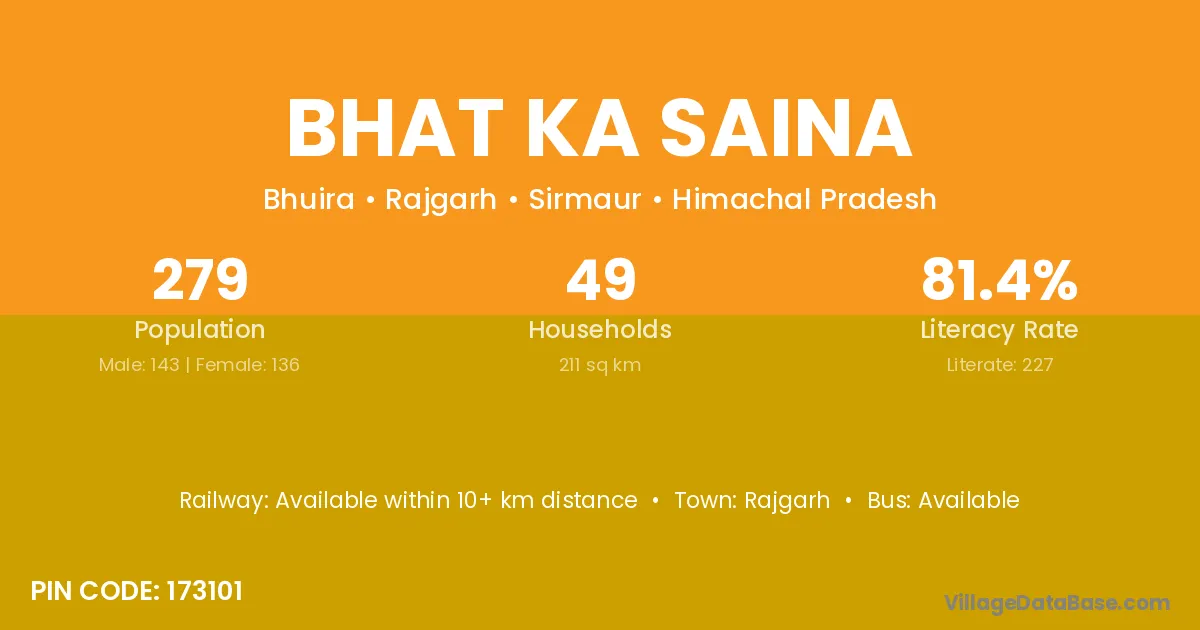Bhat Ka Saina village has a total population of 279 people, of which 143 are males and 136 are females.