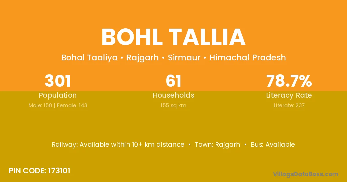Bohl Tallia village has a total population of 301 people, of which 158 are males and 143 are females.