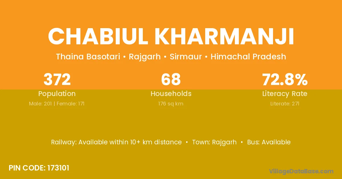 Chabiul Kharmanji village has a total population of 372 people, of which 201 are males and 171 are females.