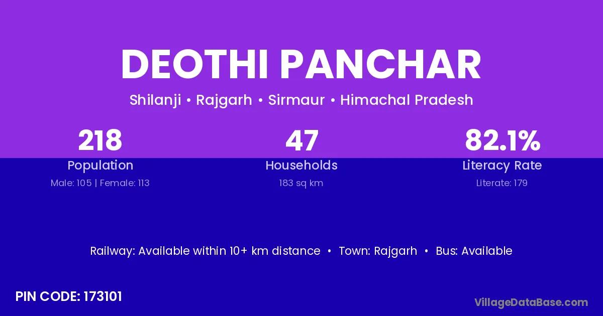 Deothi Panchar village has a total population of 218 people, of which 105 are males and 113 are females.