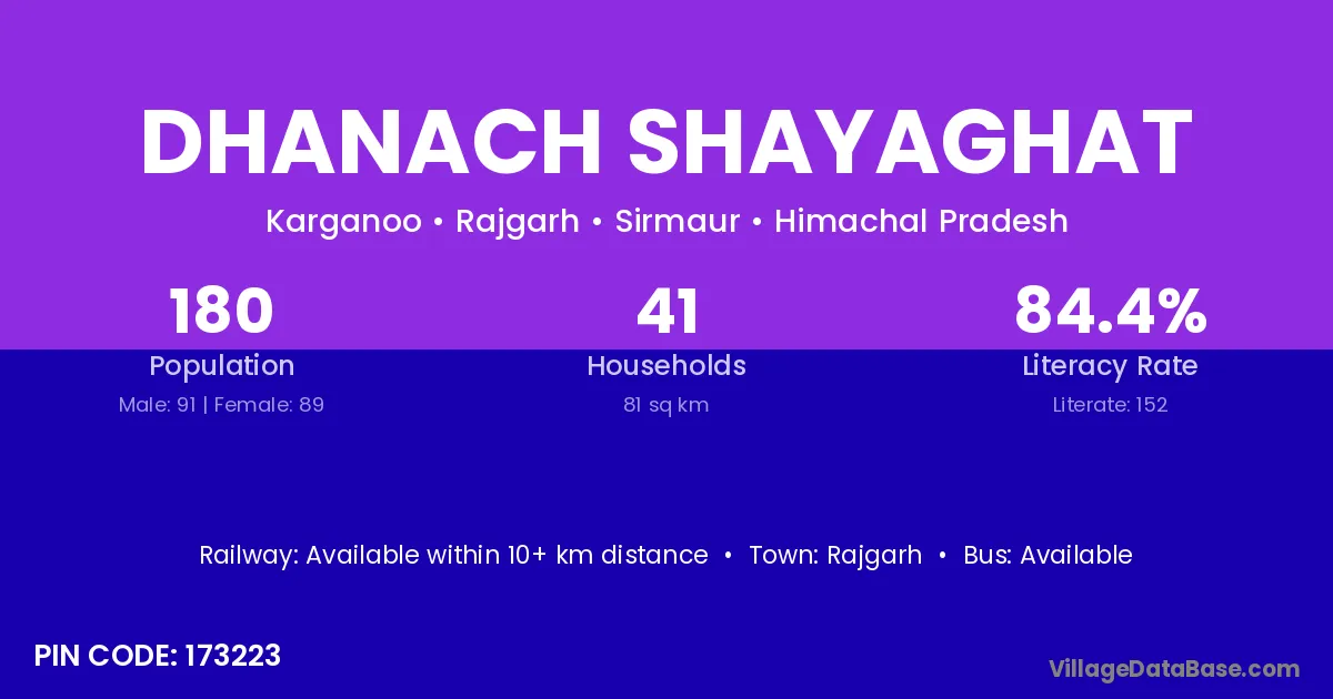 Dhanach Shayaghat village has a total population of 180 people, of which 91 are males and 89 are females.