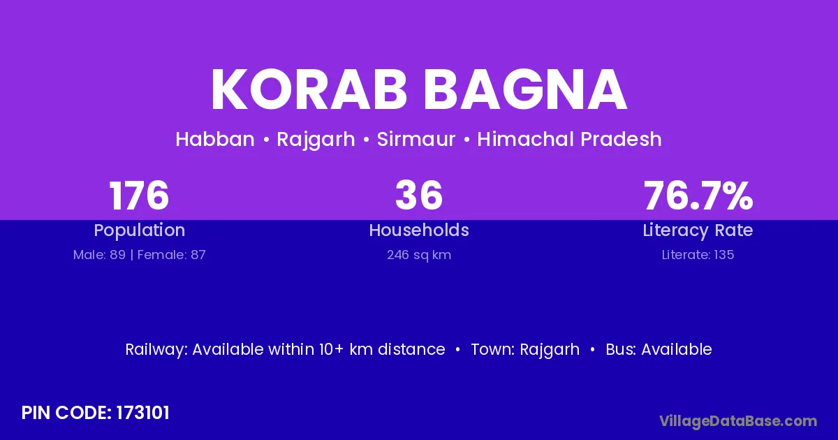 According to Census 2011 information, the village code of Korab Bagna village is 173101.