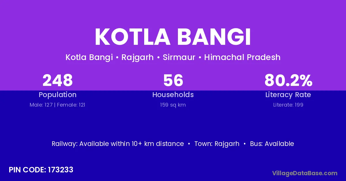 According to Census 2011 information, the village code of Kotla Bangi village is 173233.