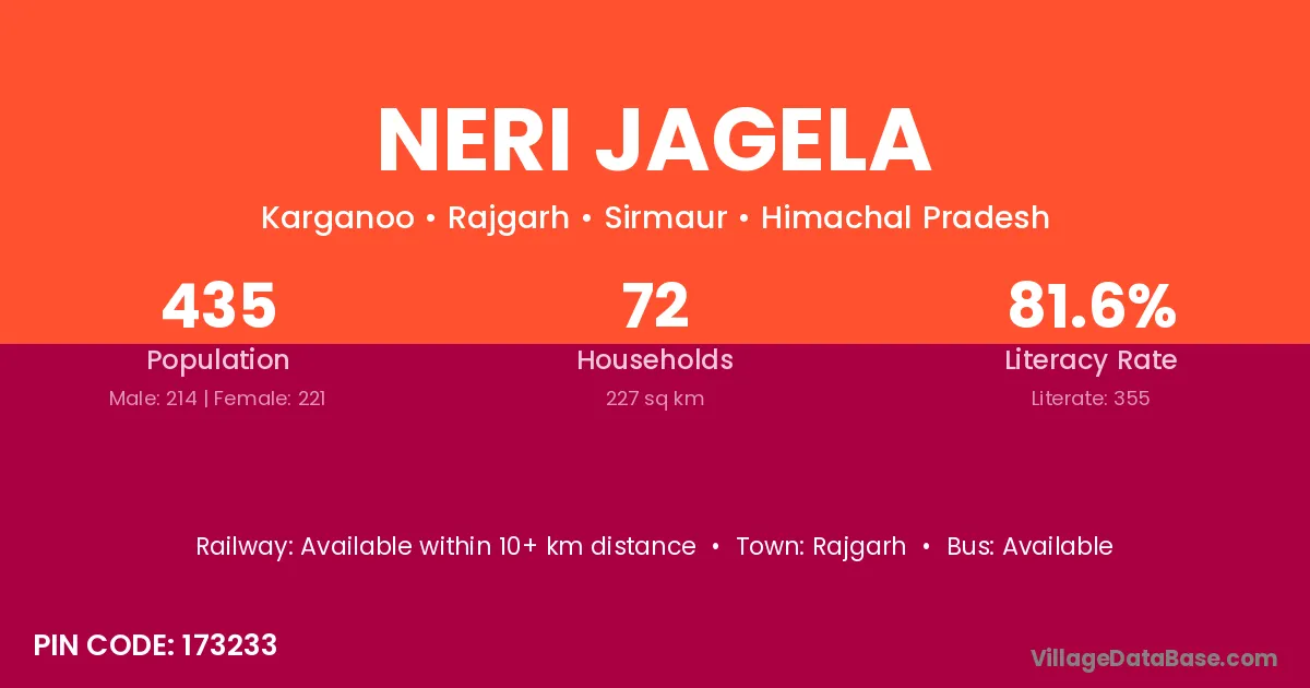 According to Census 2011 information, the village code of Neri Jagela village is 173233.