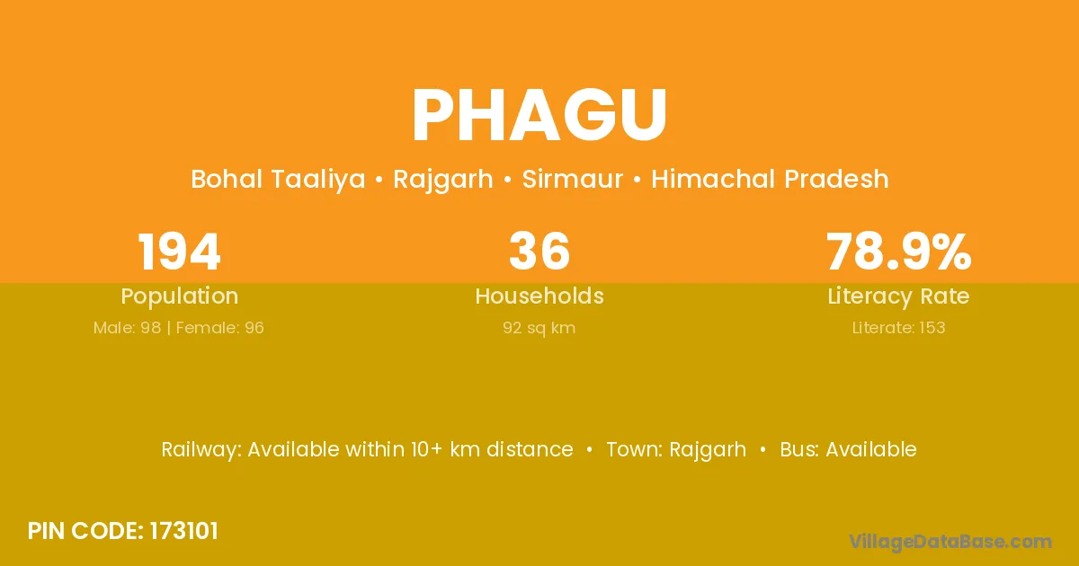 Phagu village has a total population of 194 people, of which 98 are males and 96 are females.