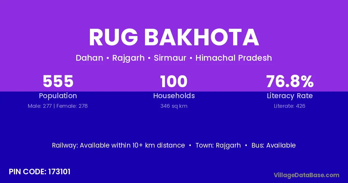 Rug Bakhota village has a total population of 555 people, of which 277 are males and 278 are females.