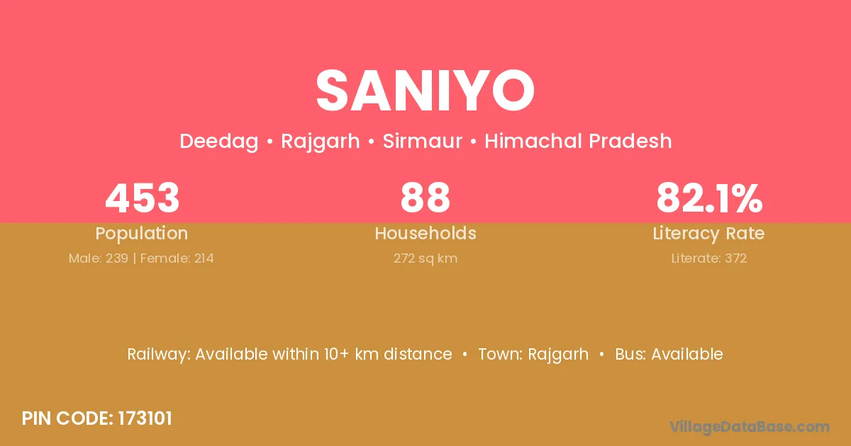 Saniyo village has a total population of 453 people, of which 239 are males and 214 are females.