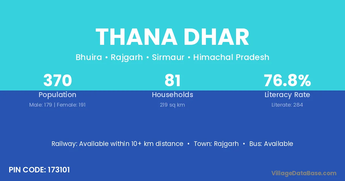 Thana Dhar village has a total population of 370 people, of which 179 are males and 191 are females.