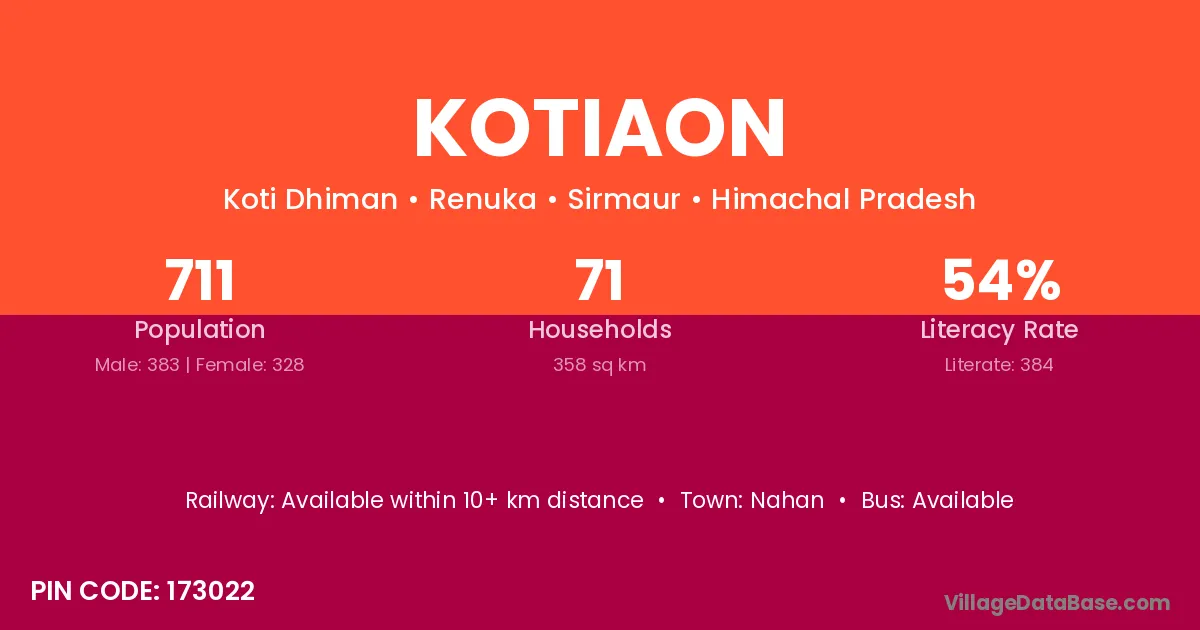 Kotiaon village has a total population of 711 people, of which 383 are males and 328 are females.