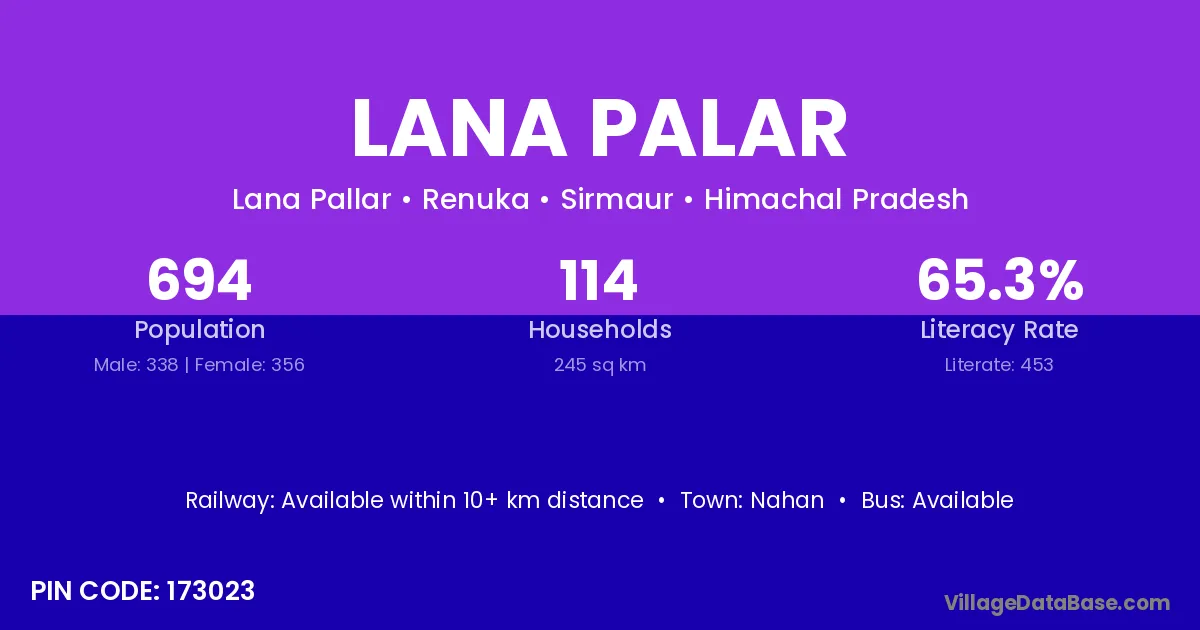 Lana Palar village has a total population of 694 people, of which 338 are males and 356 are females.