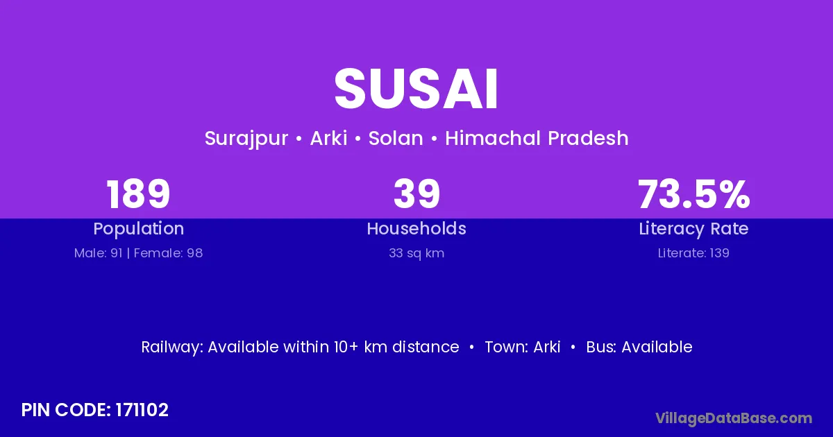 Susai village has a total population of 189 people, of which 91 are males and 98 are females.