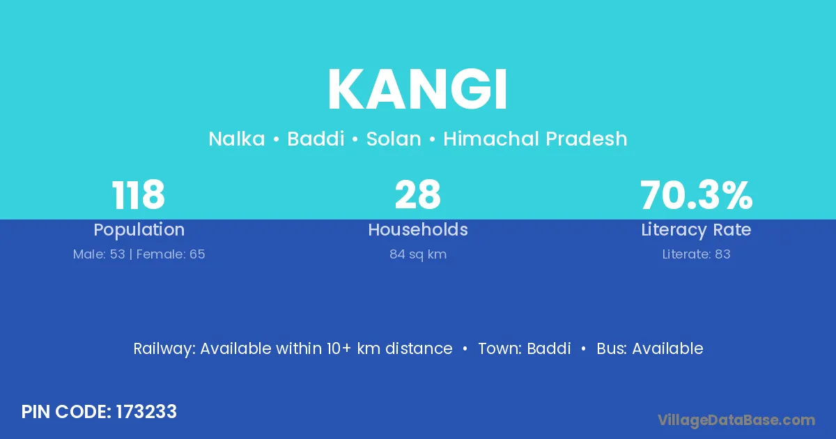 Kangi village has a total population of 118 people, of which 53 are males and 65 are females.