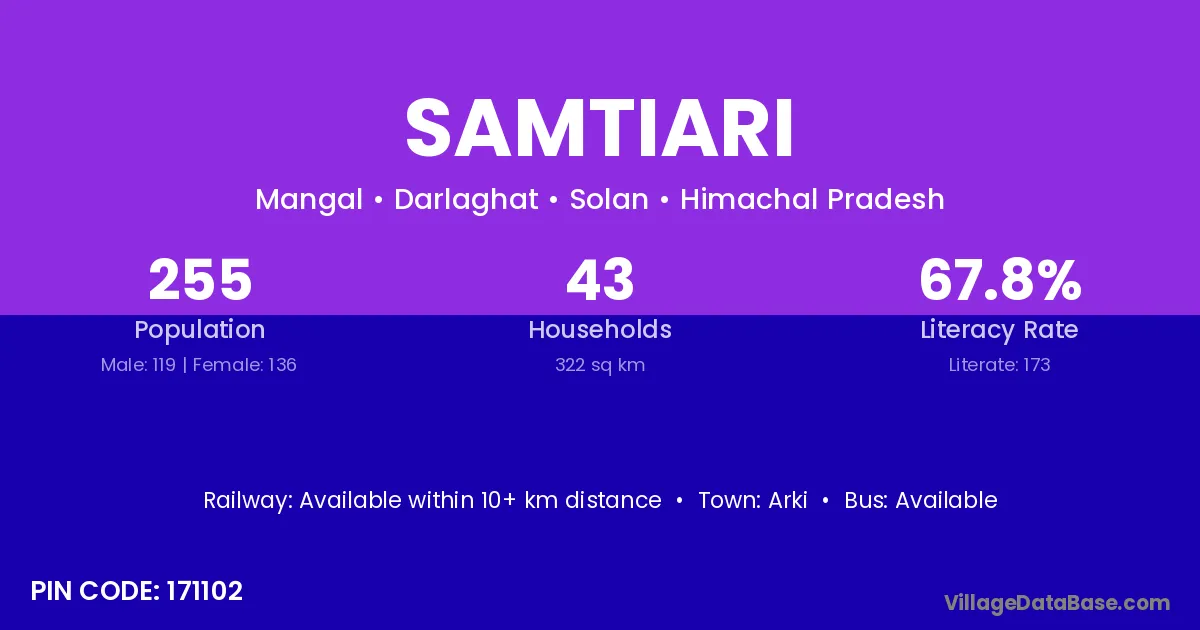 Samtiari village has a total population of 255 people, of which 119 are males and 136 are females.