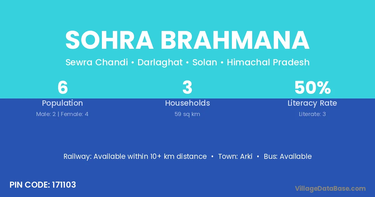 Sohra Brahmana village has a total population of 6 people, of which 2 are males and 4 are females.