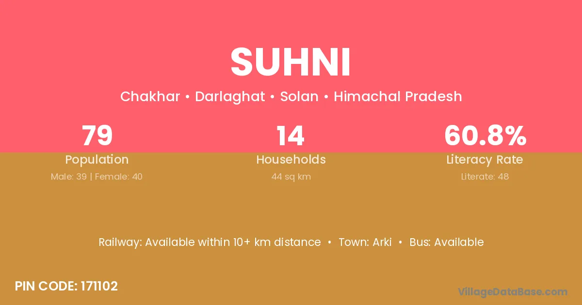 Suhni village has a total population of 79 people, of which 39 are males and 40 are females.