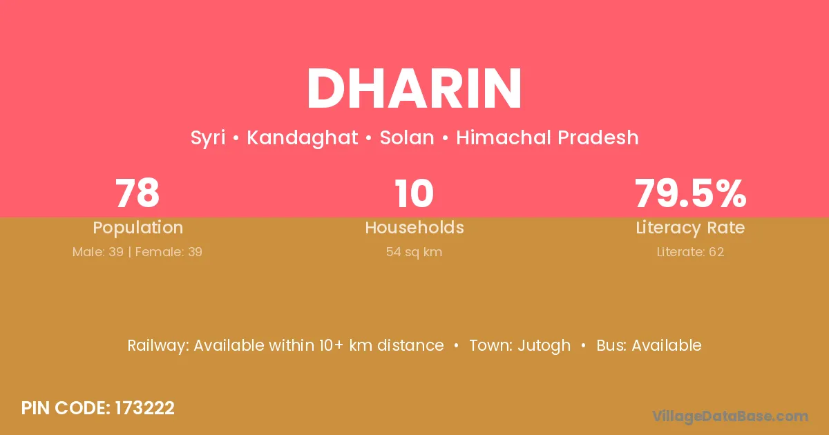 Dharin village has a total population of 78 people, of which 39 are males and 39 are females.