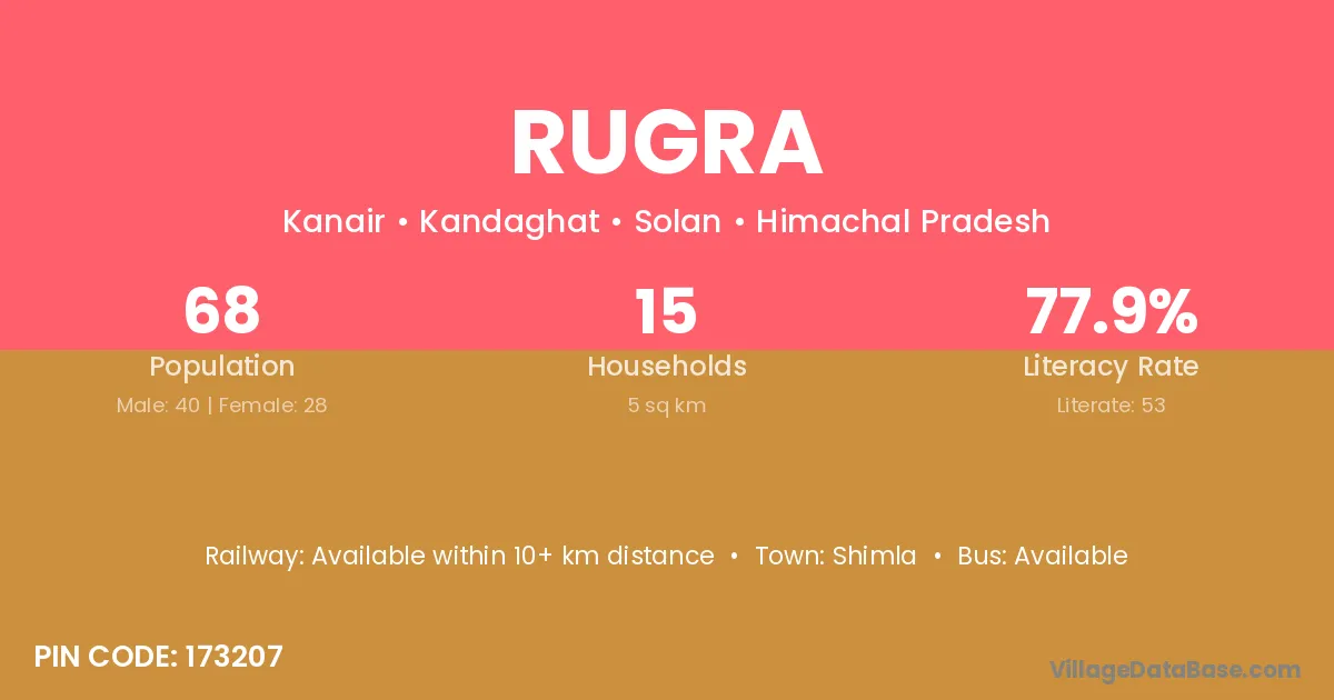 Rugra village has a total population of 68 people, of which 40 are males and 28 are females.