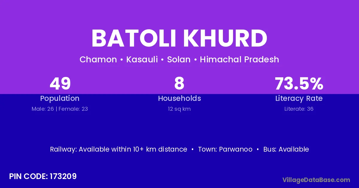 Batoli Khurd village has a total population of 49 people, of which 26 are males and 23 are females.