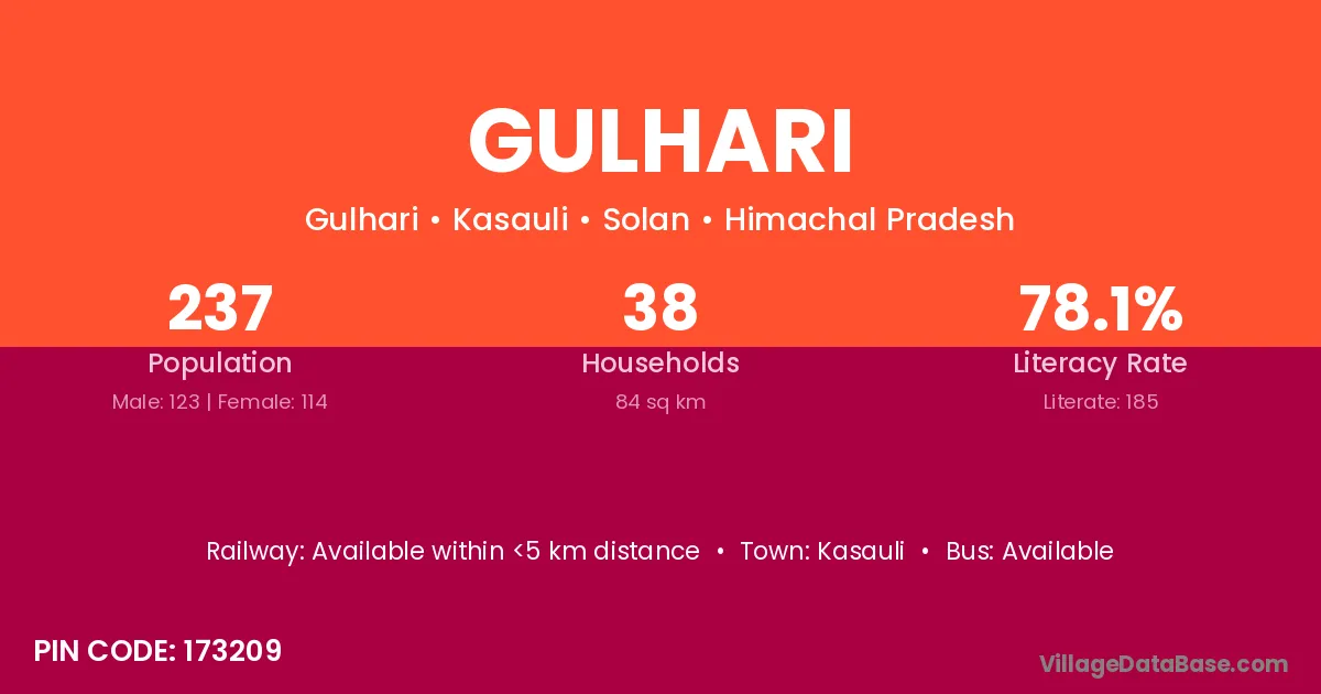 Gulhari village has a total population of 237 people, of which 123 are males and 114 are females.