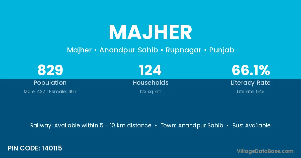 The literacy rate of Majher village is 73.08%. Male literacy stands at 78.57% and female literacy at 66.67%.