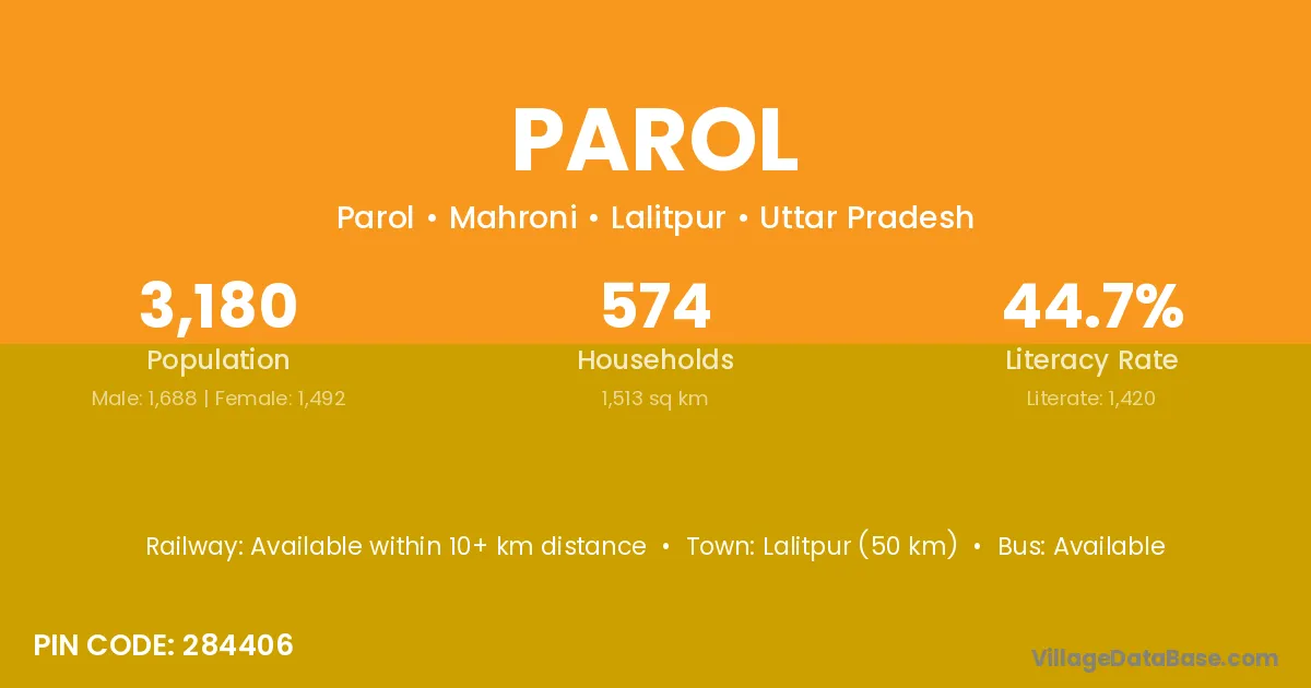 The literacy rate of Parol village is 73.49%. Male literacy stands at 76.32% and female literacy at 71.11%.
