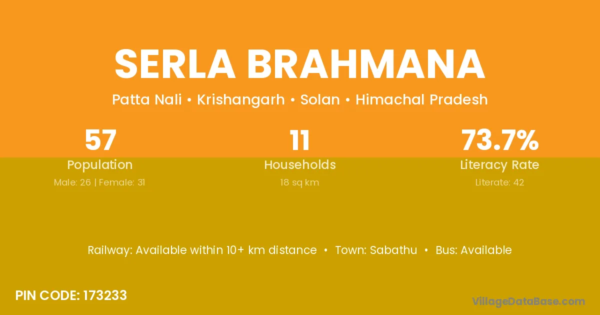 Serla Brahmana village has a total population of 57 people, of which 26 are males and 31 are females.
