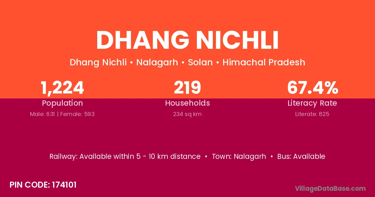 Dhang Nichli village has a total population of 1,224 people, of which 631 are males and 593 are females.