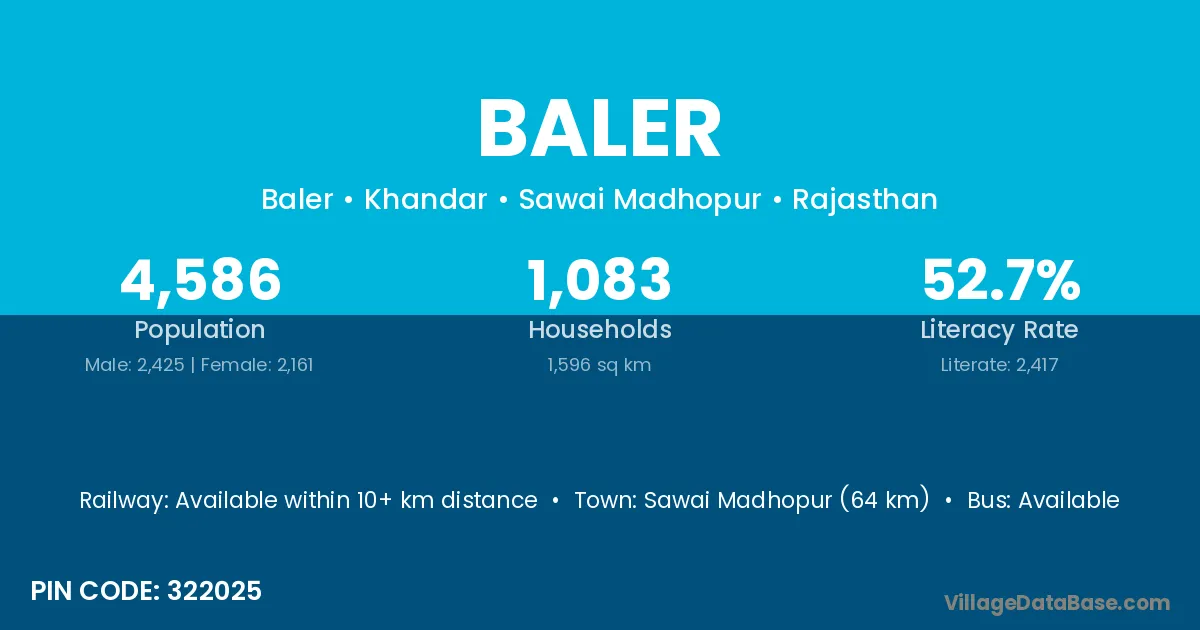 The literacy rate of Baler village is 84.74%. Male literacy stands at 81.91% and female literacy at 87.50%.