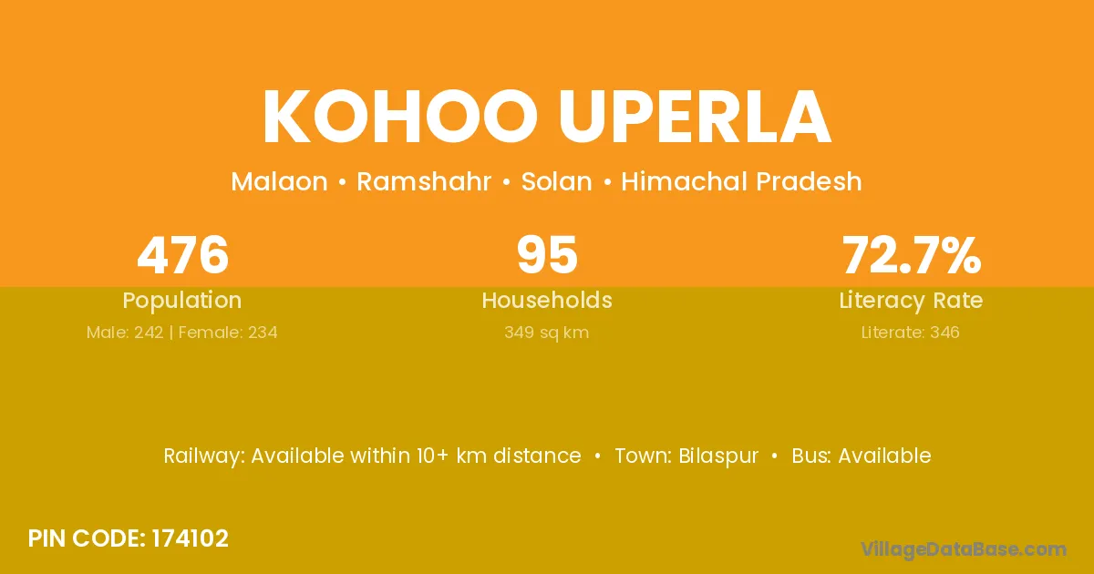 Kohoo Uperla village has a total population of 476 people, of which 242 are males and 234 are females.
