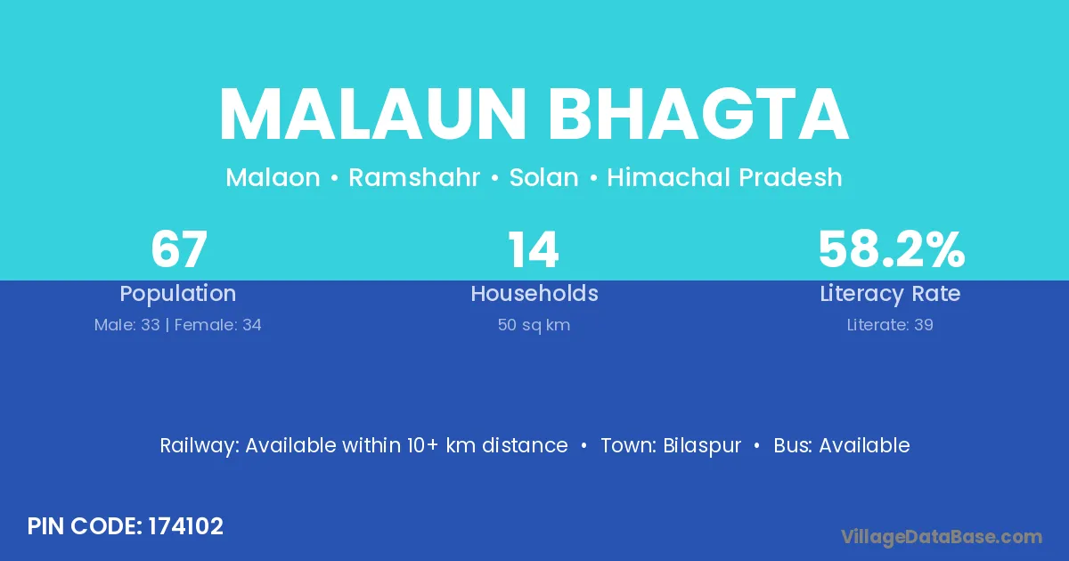 Malaun Bhagta village has a total population of 67 people, of which 33 are males and 34 are females.
