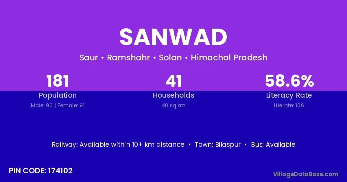 Sanwad village has a total population of 181 people, of which 90 are males and 91 are females.
