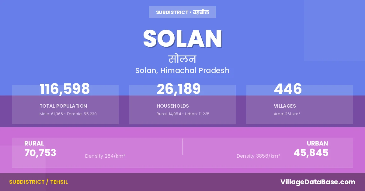 According to the 2011 census The total area of Solan Tehsil is 261 km², with a population of 116598 people. The population density is 447 inhabitants per square kilometre, and there are approximately 26189 houses in the sub district.