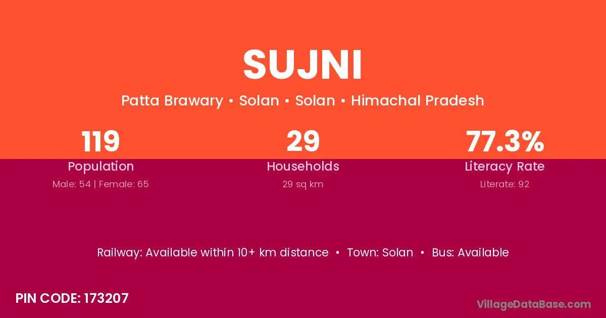 Sujni village has a total population of 119 people, of which 54 are males and 65 are females.