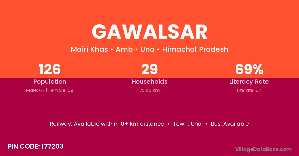 Gawalsar village has a total population of 126 people, of which 67 are males and 59 are females.