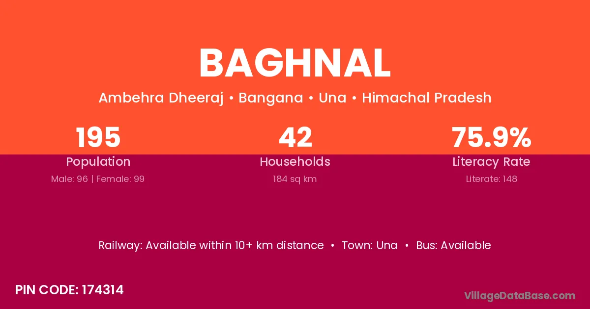 Baghnal village has a total population of 195 people, of which 96 are males and 99 are females.