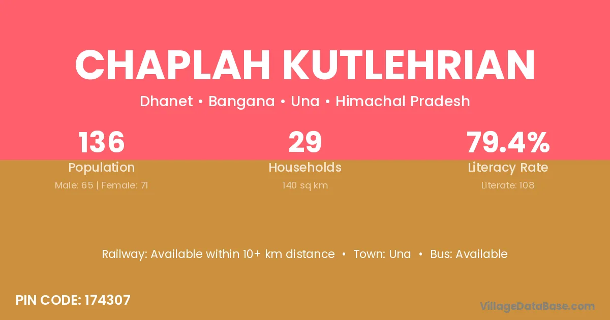 Chaplah Kutlehrian village has a total population of 136 people, of which 65 are males and 71 are females.