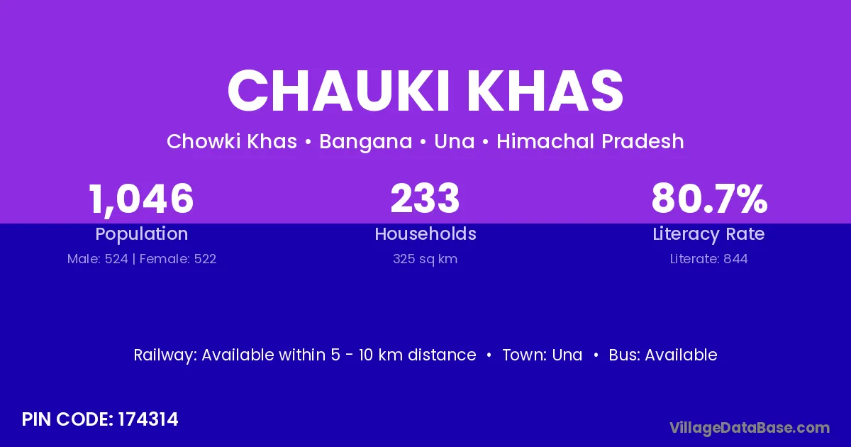 Chauki Khas village has a total population of 1,046 people, of which 524 are males and 522 are females.
