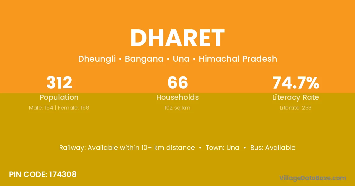 Dharet village has a total population of 312 people, of which 154 are males and 158 are females.