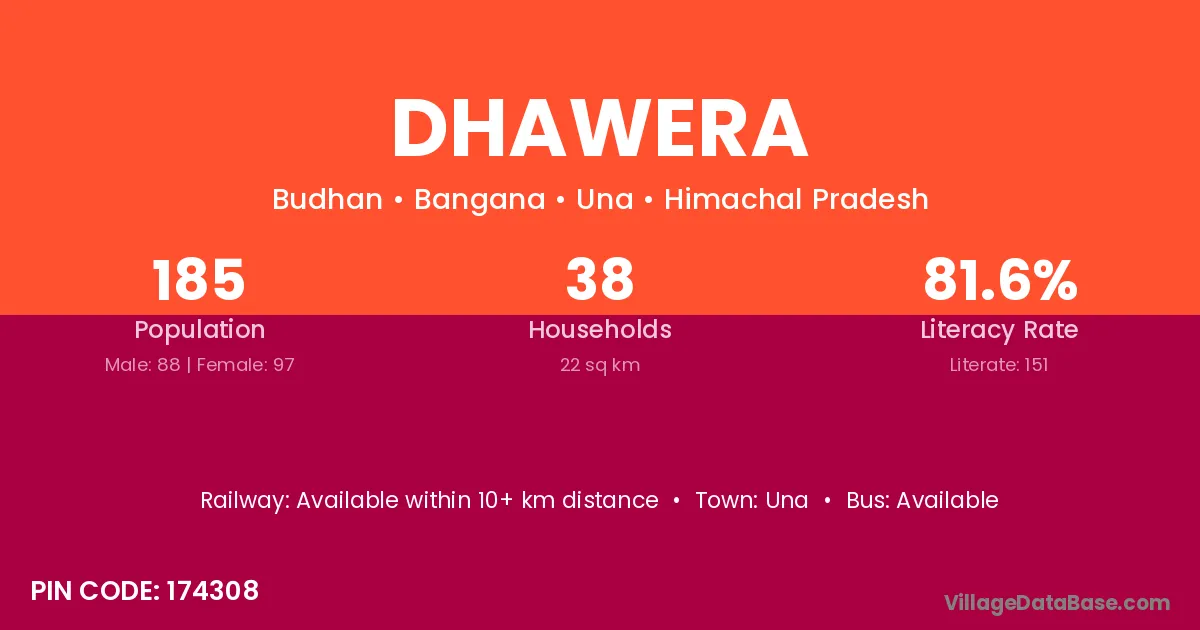 Dhawera village has a total population of 185 people, of which 88 are males and 97 are females.