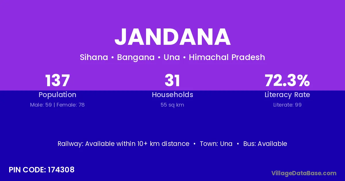 Jandana village has a total population of 137 people, of which 59 are males and 78 are females.