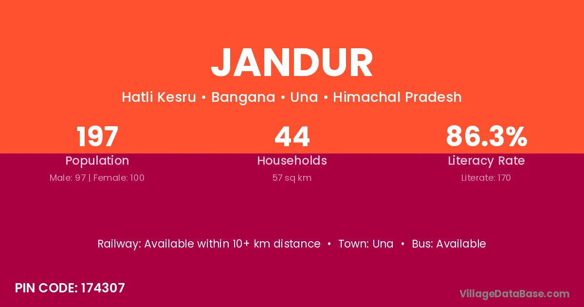 Jandur village has a total population of 197 people, of which 97 are males and 100 are females.