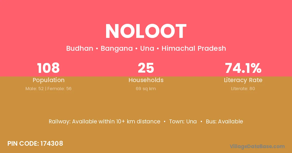 Noloot village has a total population of 108 people, of which 52 are males and 56 are females.
