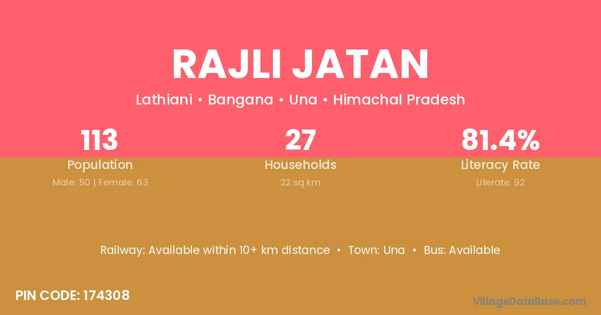 Rajli Jatan village has a total population of 113 people, of which 50 are males and 63 are females.