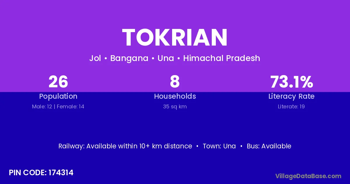 Tokrian village has a total population of 26 people, of which 12 are males and 14 are females.