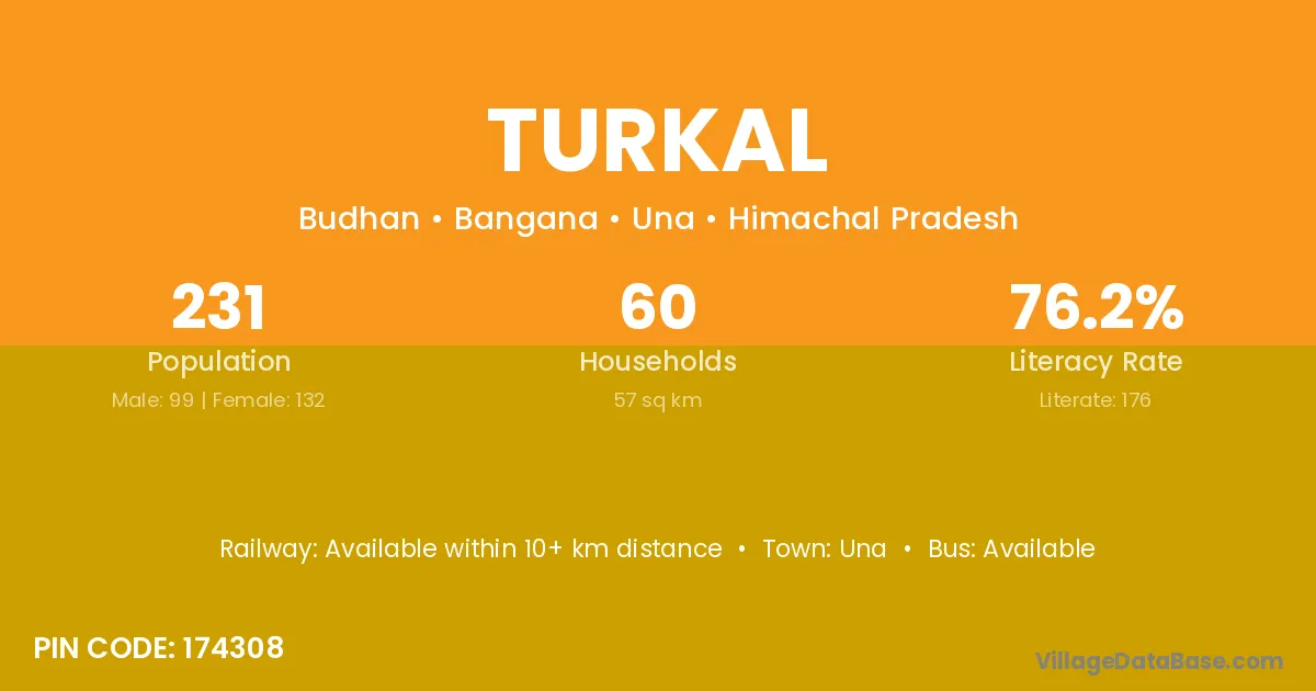 Turkal village has a total population of 231 people, of which 99 are males and 132 are females.