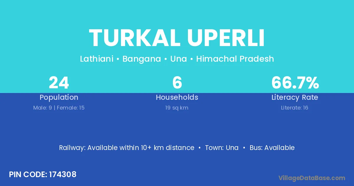 Turkal Uperli village has a total population of 24 people, of which 9 are males and 15 are females.