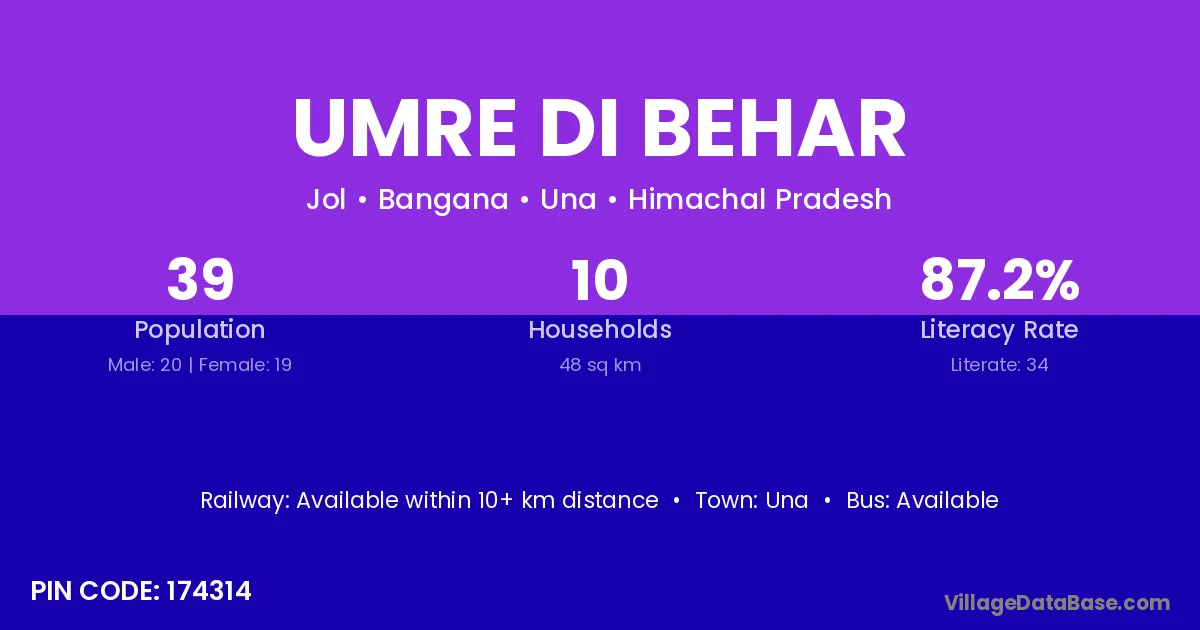 Umre Di Behar village has a total population of 39 people, of which 20 are males and 19 are females.