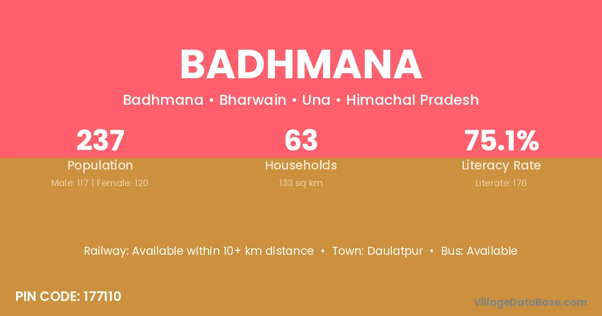 Badhmana village has a total population of 237 people, of which 117 are males and 120 are females.